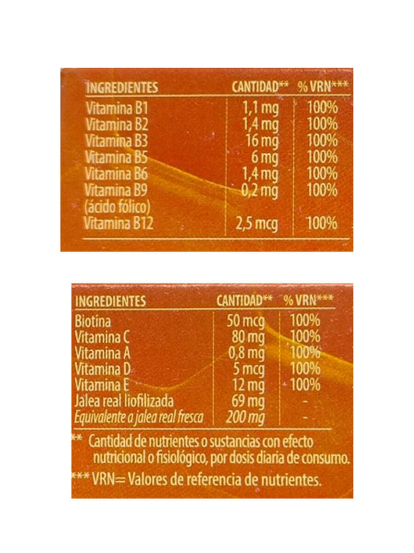 Agente de carga: aceite de girasol; agente de recubrimiento: gelatina; extracto de flores de Equinacea (Echinacea purpurea); agente de recubrimiento: glicerina; Jalea real; gluconato de zinc; ácido L-ascórbico (vitamina C); emulgente: lecitina de girasol; estabilizante: diglicéridos de ácidos grasos; extracto de Reishi; extracto de Shiitake; estabilizante: cera amarilla; colorantes; óxido de hierro rojo.