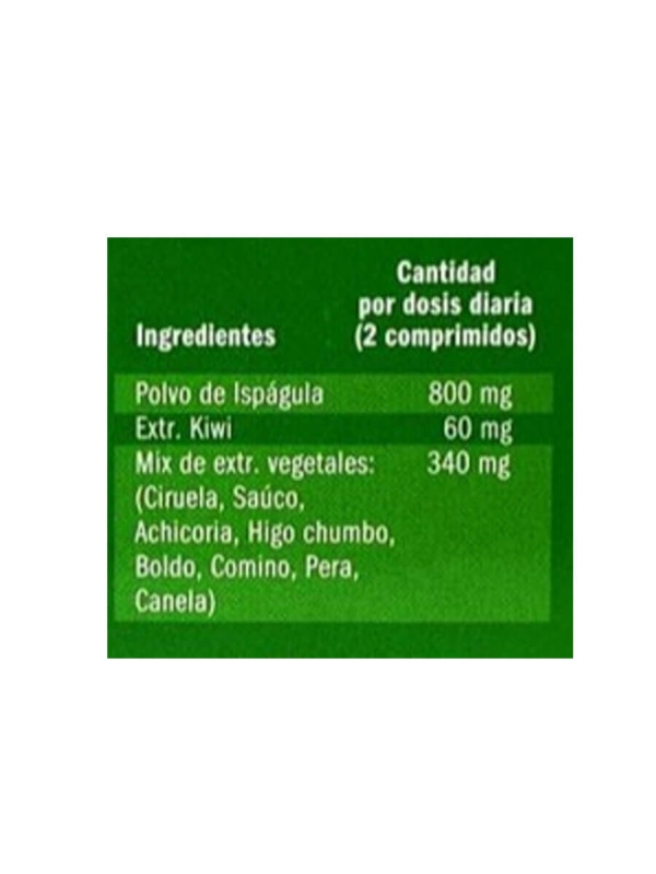 Polvo de Ispágula (400 mg), Extracto de Kiwi (30 mg), Mix de Extractos Vegetales (Ciruela, Achicoria, Saúco, Higo Chumbo, Boldo, Comino, Pera, Canela) (170 mg).