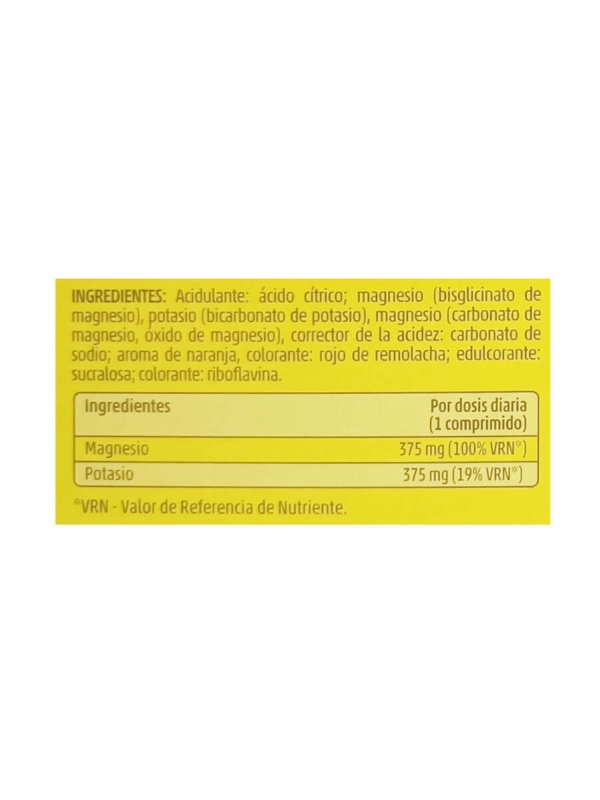 Por comprimido: Carbonato de magnesio (equivalente a 375mg de Magnesio) (100% CDR*) y bicarbonato de potasio 375mg (19% CDR*). Excipientes: ácido cítrico, óxido de magnesio, aroma de naranja, edulcorantes (E-952, E-954), inulina, colorantes (E-162, E-101 ).