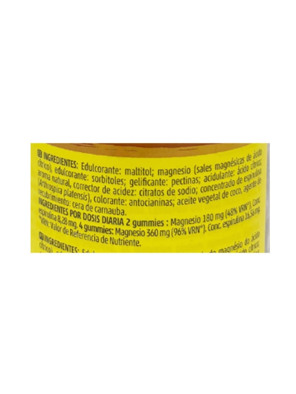 Edulcorante: maltitol; magnesio (sales magnésicas de ácido cítrico), edulcorante: sorbitoles; gelificante: pectinas; acidulante: ácido cítrico; aroma natural, corrector de acidez: citratos de sodio; concentrado de espirulina (Arthrospira platensis), colorante: antocianinas; aceite vegetal de coco, agente de recubrimiento: cera de carnauba.