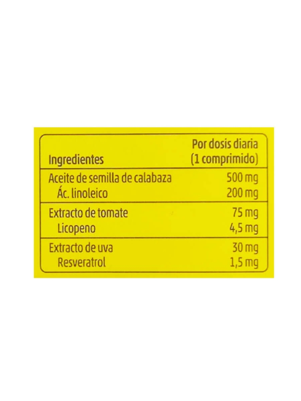 Aceite de semilla de calabaza 500mg (equivalente a 200 mg de ácido linoleico), extracto de tomate 75 mg (equivalente a 4,5 mg de licopeno), extracto de uva 30 mg (equivalente a 1,5 mg de resveratrol).