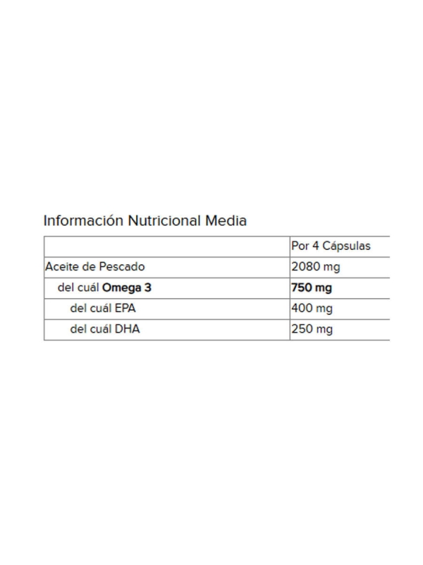 Aceite de pescado (Familia de los Salmónidos, Clupeidos, Engráulidos) rico en EPA y DHA - Antioxidantes: Extracto rico en tocoferoles, galato de propilo, palmitato de L-ascorbilo. CÁPSULA DE ORIGEN MARINO: Gelatina (pescado) - Glicerol.