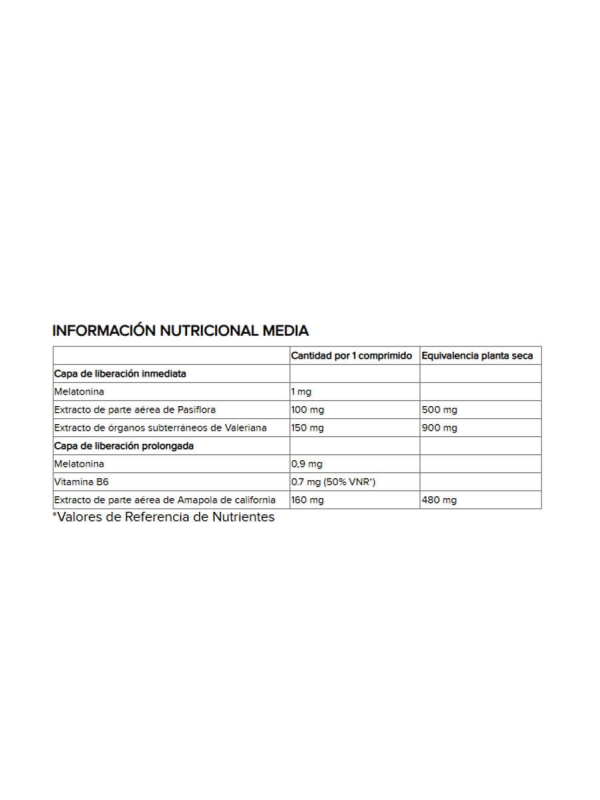 Melatonina 1.9mg, extracto de Valeriana, Extracto de Pasiflora, Extarto de Amapola de California.