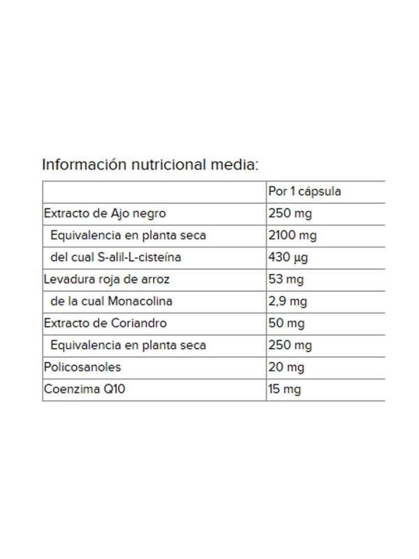 Extracto de bulbo de ajo negro (Allium sativum L.) – Levadura roja de arroz (Monascus purpureus Went) rica en Monacolinas - Extracto de fruto de cilantro (Coriandrum sativum L.) - Policosanoles de caña de azúcar (Saccharum officinarum L.) - Coenzima Q10 - Almidón de maíz. Cubierta de la cápsula de origen vegetal: hidroxipropilmetilcelulosa.