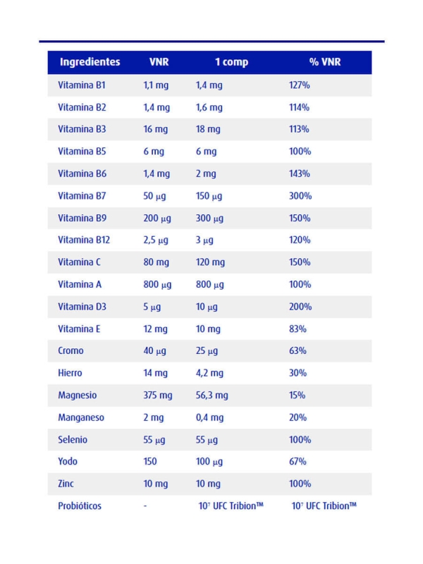 Vitamina B1; Vitamina B2;Vitamina B3; Vitamina B5; Vitamina B6; Vitamina B7; Vitamina B9; Vitamina B12; Vitamina C; Vitamina A; Vitamina D3; Vitamina E12; Cromo; Hierro; Magnesio; Manganeso; Selenio; Yodo; Zinc1; Probióticos