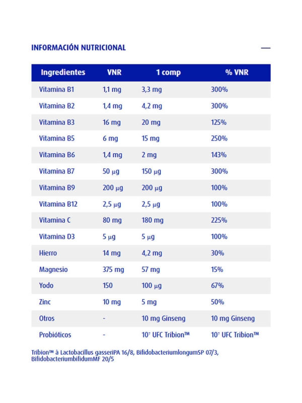 Con 3 probióticos, 12 vitaminas y 7 minerales. Las vitaminas B2, B3 y B7 ayudan al intestino², las Vitaminas B12 y B6 ayudan al metabolismo energético¹, la Vitamina C y el Hierro ayudan a la reducción de la fatiga¹. Cada comprimido contiene 10 millones de probióticos (L. gasseri, B. bifidum, B. longum) seleccionados para llegar vivos al intestino