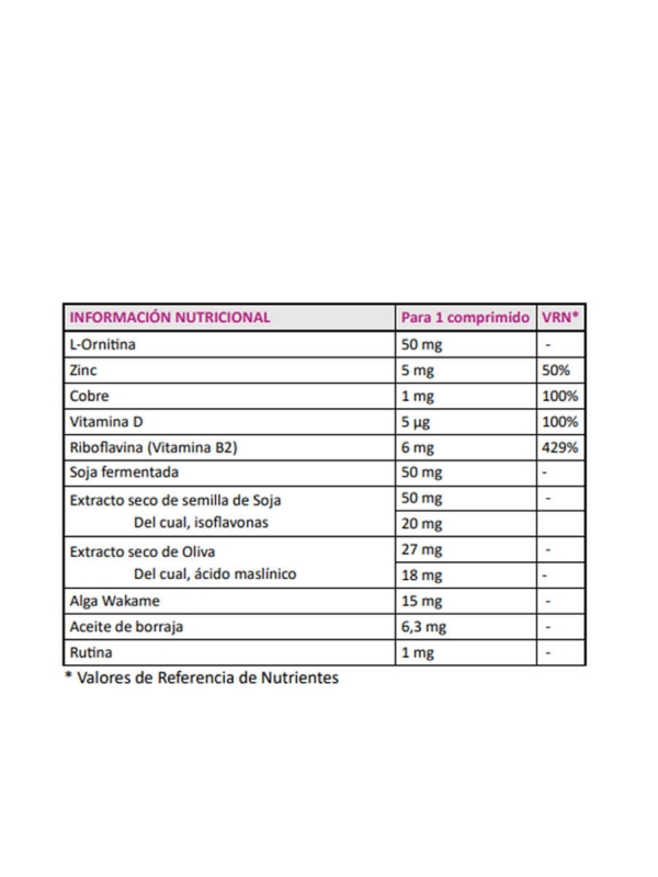 Agente de carga: celulosa microcristalina, fosfato de calcio; Clorhidrato de L-Ornitina, Soja fermentada (contiene leche y productos derivados), Extracto seco de semilla de soja (Glycine max (L.) Merr.), Agente de carga: hidroxipropilmetilcelulosa; Levadura con Vitamina D, Maltodextrina, Extracto seco de Oliva (Olea europaea L. ), Agente de carga: carboximetilcelulosa sódica reticulada, carboximetilcelulosa sódica; Bisglicinato de zinc, Almidón de maíz, Alga Wakame (Extracto seco de talo de Undaria pinnatifida (Harvey) Suringar, dextrinas de maíz), Agente de carga: Manitol; Emulgentes: Mono y diglicéridos de ácidos grasos; Agentes de recubrimiento: Estearato de magnesio, Ácido esteárico; Antiaglomerante: Dióxido de silicio; Riboflavina (Vitamina B2), Aceite de Borraja (Borrago officinalis L.); Dextrinas de tapioca, Bisglicinato de cobre, Rutina; Colorante: Ácido carmínico.