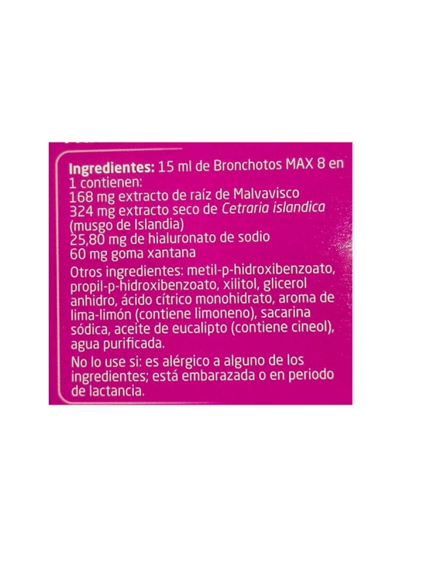 Gracias a sus ingredientes naturales como el malvavisco y el musgo de Islandia, Bronchotos Max 8 en 1 forma una película protectora en la garganta, aliviando la irritación y calmando la tos. Además, sus propiedades fluidificantes facilitan la expulsión de las mucosidades, descongestionando las vías respiratorias.