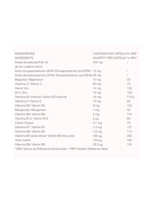 Aceite de pescado 30% omega 3, Óxido de Magnesio, Carbonato Cálcico, Ácido Ascórbido, Fosfato de Calcio, Sulfato Ferroso, Sulfato de Cinc, Lecitina de Soja ,Nicotinamida, Pantotenato cálcico, Acetato de tocoferol, Cera amarilla de abejas, Sulfato de manganeso, Cianocobalamina 0.1% malto, Piridoxina clorhidrato, Sulfato de cobre, Riboflavina, Tiamina, Ácido fólico, Yoduro potásico, Biotina.