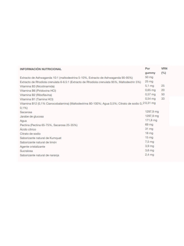 Contenidos medios por dosis diaria (2 caramelos de goma): Azúcar, jarabe de glucosa, agua, gelificante: pectinas, extracto de raíz de ashwagandha (Withania somnifera (L.) Dunal):100mg, corrector de acidez: ácido cítrico, extracto de raíz de rhodiola (Rhodiola crenulata): 50mg, corrector de acidez: citratos de sodio, aroma natural de kumquat, aroma natural de limón, nicotinamida (niacina: 8,0 mg NE [50%*]), agente de recubrimiento: cera carnaúba, edulcorante: sucralosa, aroma natural de naranja, clorhidrato de piridoxina (vitamina B6: 0,86 mg [61%*]), riboflavina (vitamina B2: 0,74 mg [53%*]), clorhidrato de tiamina (vitamina B1: 0,60 mg [55%*]) y cianocobalamina (vitamina B12: 0,60μg [24%*]).