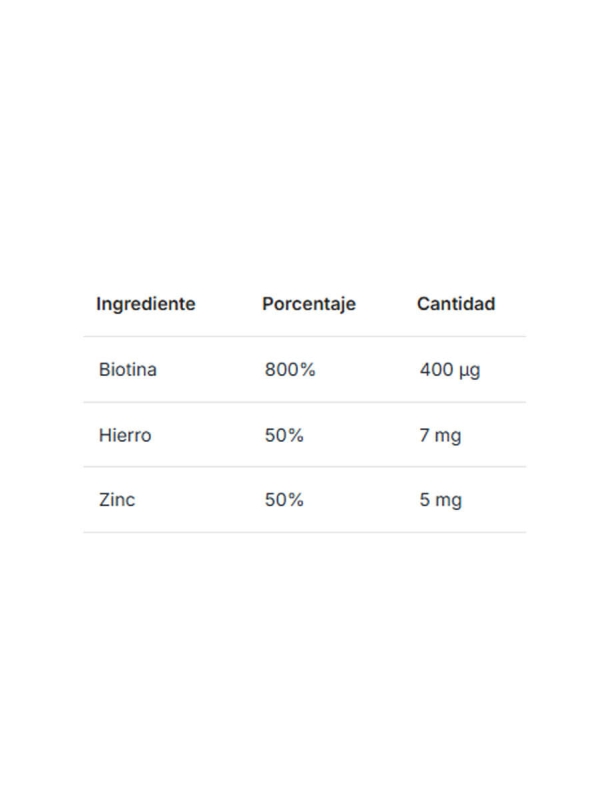 Agente de carga(Celulosa microcristalina), Sulfato Ferroso(Hierro 20%)35 mg, Agente de carga(Estearato de magnesio), Antiaglomerante(Dióxido de silicio), Óxido de Zinc(Zinc 80%)6,22 mg, D-biotina(Biotina)400 µg
