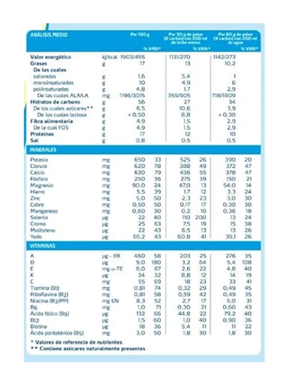 Maltodextrina, proteínas de suero de leche, aceite de canola, fructooligosacáridos, minerales (cloruro de potasio, hidróxido de calcio, citrato de sodio, fosfato de sodio, fosfato de calcio, cloruro de calcio, citrato de magnesio, citrato de potasio, fosfato de potasio, cloruro de sodio, hidróxido potásico, hidróxido de magnesio, sulfato de hierro, cloruro de cromo, sulfato de zinc, molibdato de sodio, sulfato de manganeso, sulfato de cobre, yoduro de potasio, selenito de sodio), vitaminas (ácido l-ascórbico, dl-alfa-tocoferol, nicotinamida, retinol, colecalciferol, d-pantotenato cálcio, fitomenadiona, d-biotina, clorhidrato de piridoxina, moninitrato de tiamina, riboflavina, ácido fólico, cianocobalamina), aroma (vainilla), emulgente: lecitina de soja, edulcorante (acesulfame K), edulcorantes (sucralosa), antioxidantes (extracto rico en tocoferoles, palmitato de ascorbilo).