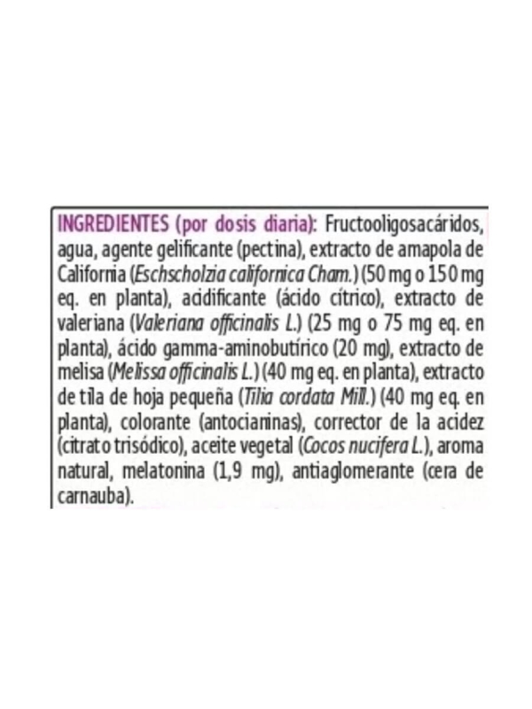 1,9 mg melatonina.25 mg valeriana, 50 mg de Amapola de california. 10 mg de Melisa, 10 mg de tila y 100 mg de GABBA