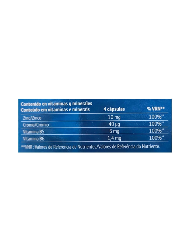 agente de carga (celulosa microcristalina), OXY-288 [(extractos de frijol (Phaseolus vulgaris L.), de olivo (Olea europaea L.) y de romero (Rosmarinus officinalis L.)] (500 mg), cubierta de la cápsula (gelatina, colorante: carbonato cálcico), extracto de nopal (Opuntia ficus-indica (L.) Mill.) (200 mg equivalen a 2.000 mg en planta), antiaglomerantes (dióxido de silicio, sales de magnesio de ácidos grasos), extracto de pimiento dulce (Capsicum annuum L.) (140 mg equivalen a 1,4 mg de capsaicina), extracto de mirobálano (Terminalia chebula Retz.) (50 mg equivalen a 200 mg en planta), extracto de saúco (Sambucus nigra L.) (45 mg equivalen a 225 mg en planta), zinc (citrato de zinc), extrait de comino (Carum carvi L.) (30 mg equivalen a 300 mg en planta), vitamina B5 (D-pantotenato de cálcio), vitamina B6 (cloridrato de piridoxina), cromo (picolinato de cromo).