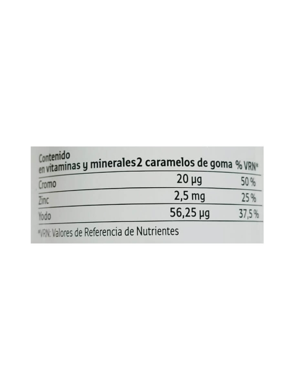 Edulcorantes (maltitol, sorbitol), agua, agente gelificante (pectina), acidificante (ácido cítrico), extracto de ascophyllum (Ascophyllum nodosum (L.) Le Jolis) (75 mg equivalen a 300 mg en planta) (moluscos, pescado, crustáceos), extracto de kola (Cola nitida (Vent.) Schott et Endl.) (70 mg equivalen a 280 mg en planta), extracto de diente de león (Taraxacum (L.) Weber ex F.H.Wigg.) (37,5 mg equivalen a 150 mg en planta), correctorla acidez (citrato trisódico), aceite vegetal (Cocos nucifera L.), agente de carga (maltodextrina), aroma natural, citrato de zinc, colorante (antocianinas), antiaglomerante (cera de carnaúba), picolinato de cromo.