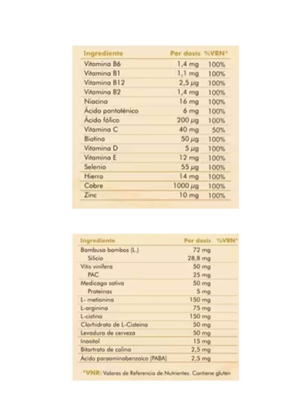 Vitaminas del grupo B, C, D y E, Niacina, Ácido pantoténico, ácido fólico, biotina, selenio, hierro, cobre, zínc, silicio, Bambusa vambos, vitis vinifera, medicago sativa, L-metionina, L-arginina, L-cistina, clorhidrato de L-cisteina, levadura de cerveza, inositol, bitartrato de colina, ácido paraaminobenzoíco