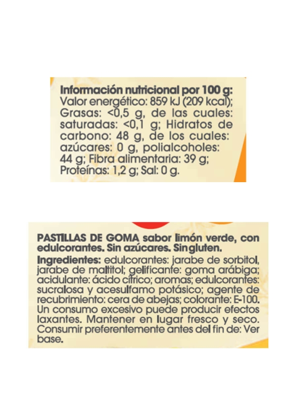 Pastillas de goma refrescantes sabor limón verde con edulcorantes.