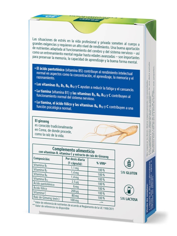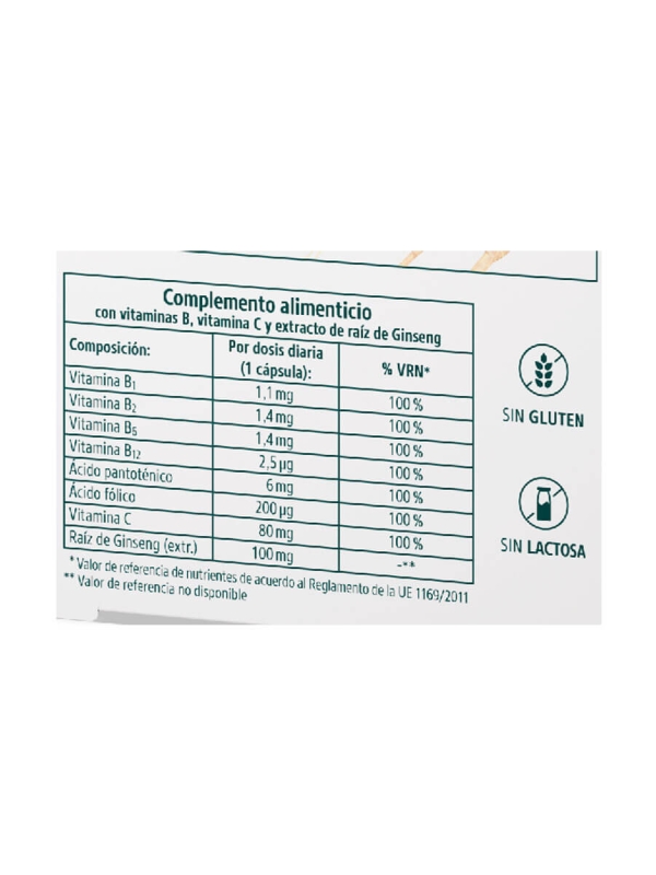 Composición por cantidad diaria (1 cps): ginseng (extr.) 100mg; vitamina C 80mg (100% VRN*); vitamina B2 1,4mg (100% VRN*); vitamina B6 1,4mg (100% VRN*); vitamina B1 1,1mg (100% VRN*); ácido fólico 200 µg (100% VRN*); ácido pantoténico 6 µg (100% VRN*); vitamina B12 2,5 µg (100% VRN*)