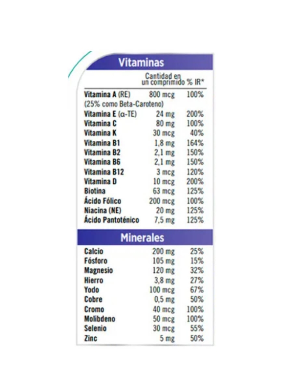 Fosfato dicálcico, óxido de magnesio, carbonato cálcico, incrementador de volumen (E 460, E 464, E 1200), ácido L-ascórbico, antiaglomerante (E 468, E 470b, E 551, E 553b), acetato DL-alfa tocoferilo, nicotinamida, fumarato ferroso, D-pantotenato de calcio, óxido de zinc, piridoxina clorhidrato, mononitrato de tiamina, riboflavina, beta-caroteno, aceite vegetal (coco y palma), sulfato cúprico, acetato de retinilo, ácido pteroilmonoglutámico, cloruro de cromo (III), molibdato de sodio, yoduro potásico, seleniato sódico, D-biotina, filoquinona, colecalciferol, cianocobalamina, colorante (E 132).
