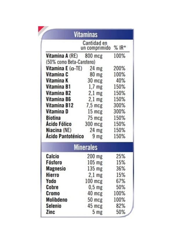 Fosfato dicálcico, óxido de magnesio, carbonato cálcico, incrementador de volumen (E 460, E 464, E 1200), ácido L-ascórbico, antiaglomerante (E 468, E 470b, E 551, E 553b), acetato DL-alfa tocoferilo, nicotinamida, fumarato ferroso, D-pantotenato de calcio, óxido de zinc, piridoxina clorhidrato, mononitrato de tiamina, riboflavina, beta-caroteno, aceite vegetal (coco y palma), sulfato cúprico, acetato de retinilo, ácido pteroilmonoglutámico, cloruro de cromo (III), molibdato de sodio, yoduro potásico, seleniato sódico, D-biotina, filoquinona, colecalciferol, cianocobalamina, colorante (E 132).