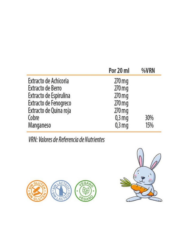 Agua purificada, sirope de agave, agente de carga (glicerina), jugo concentrado de frambuesa (Rubus idaeus L.), extractos de plantas: fenogreco (Trigonella foenum-graecum L.), espirulina (Spirulina maxima Setch. y Garner), quina roja (Cinchona pubescens Vahl), achicoria (Cichorium intybus L.), berro (Nasturtium officinale R. Br.), aromatizante (aroma de frambuesa), conservante (sorbato de potasio), acidificante (ácido cítrico), gluconato de manganeso, gluconato de cobre.