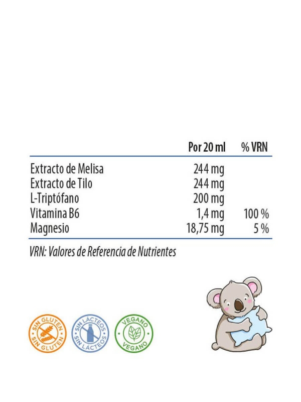 Agua purificada, sirope de agave, agente de carga (glicerina), gluconato de magnesio, extractos de plantas: melisa (Melissa officinalis L.), tilo (Tilia cordata Miller), L-triptófano, aromatizante (aroma de manzana), acidificante (ácido cítrico), conservante (sorbato potásico), espesante (goma xantana), piridoxina HCl.