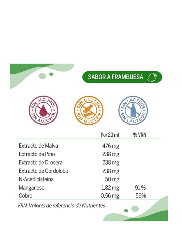 Agua purificada, miel, agente de carga (glicerina), edulcorante (fructosa), extractos de plantas: flor de malva (Malva sylvestris L.), yemas de pino silvestre (Pinus sylvestris L.), planta entera de drosera (Drosera rotundifolia L.) y hojas de gordolobo (Verbascum thapus L.), antioxidante (vitamina C), aromatizante (aroma de frambuesa), acidificante (ácido cítrico), N-acetilcisteína, conservante (sorbato de potasio), espesante (goma xantana), gluconato de manganeso, gluconato de cobre.