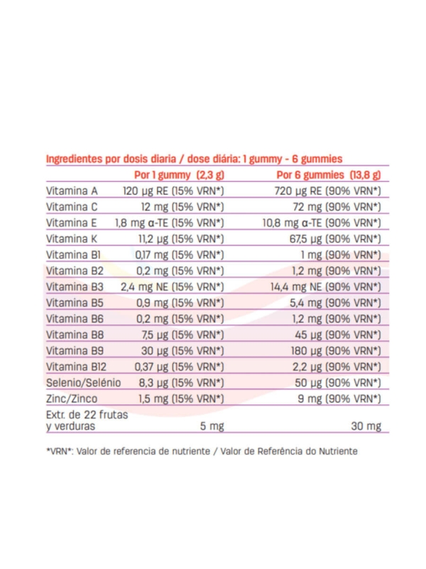 Estas gominolas aportan una combinación equilibrada de vitaminas esenciales que apoyan el crecimiento, el desarrollo cognitivo y el bienestar general, contribuyendo al equilibrio nutricional diario en la infancia.