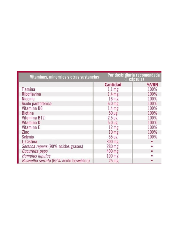 Tiamina, Riboflavina, Niacina, Acido pantoténico, Vitamina B6, Biotina, Vitamina B12, Vitamina D, Vitamina E, Zinc, Selenio, L-Cistina, Serenoa repens (90% acidos grasos), Cucurbita pepo, Humulus lupulus, Baswellia serrata (65% ácido boswélico).