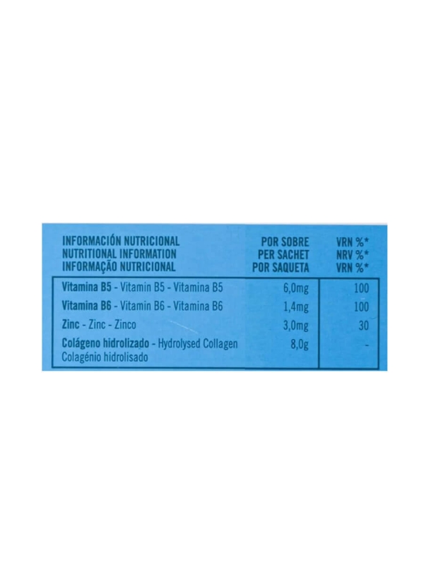 Agua purificada, Colágeno hidrolizado, Humectante (Glicerina vegetal), Acidulante (Ácido cítrico anhidro), Conservador (Sorbato potásico), Espesante (Goma xantana), Aroma, Sulfato de zinc, Vitamina B5 / Ácido pantoténico (Dexpantenol), Edulcorantes (Sucralosa, Glucósidos de esteviol procedentes de estevia) y Vitamina B6 (Clorhidrato de piridoxina).
