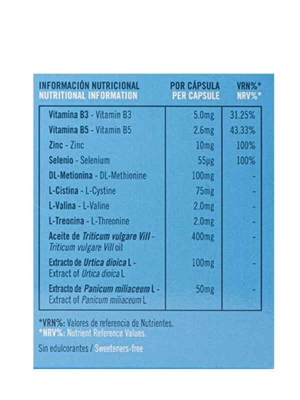 Wheat germ oil (Triticum vulgare Vill.), Coating agent (Gelatin), DL-Methionine, Dry leaf extract of Green nettle (Urtica dioica L.), Humectant (Glycerine), L-Cystine, Dry seed extract of Millet (Panicum milaceum L.), Zinc sulphate, Emulsier (Soy Lecithin), Thickener (Glyceryl monostearate), Vitamin B3 / Niacin (Nicotinamide), Vitamin B5 / Pantothenic acid (D-pantothenate calcium), L-Valine, L-Threonine, Colours (Red iron oxide and Black iron oxide, Titanium dioxide, Carminic acid) and Sodium selenite.