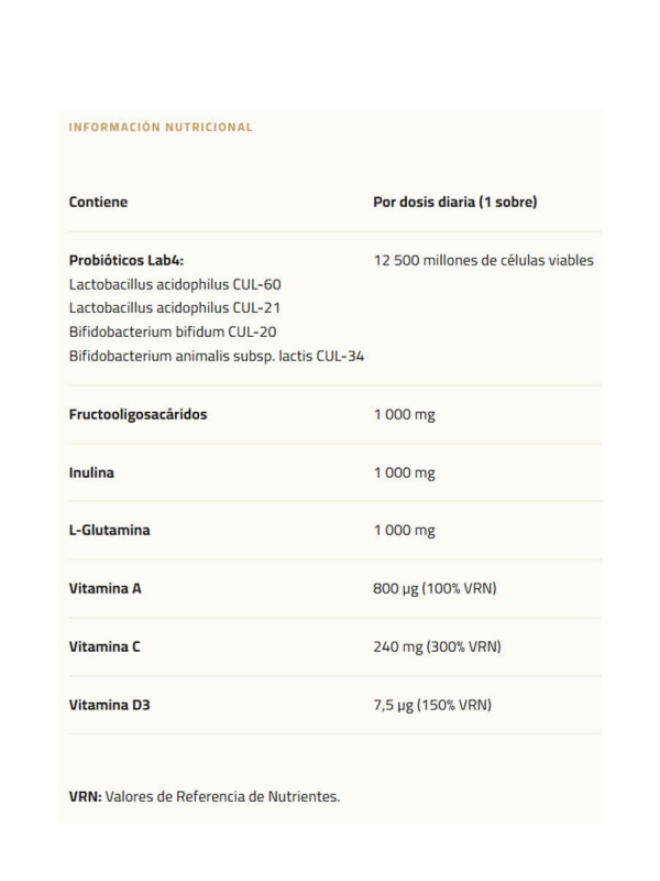12,5 mil millones de bacterias activas Lab4, 1 000 mg FOS, 1 000 mg inulina, 800 mg Vitamina A, 240 mg Vitamina C, 7,5 mg Vitamina D3, 1 000 L-Glutamina