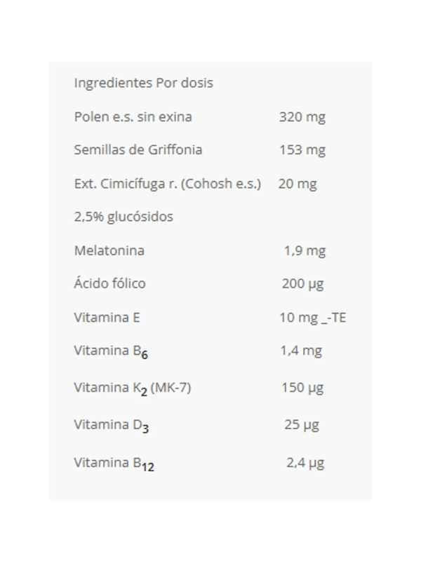 Polen e.s. sin exina, Semillas de Griffonia, Ext. Cimicífuga r. (Cohosh e.s.), glucósidos, Melatonina 1,9 mg, Ácido fólico, Vitamina E, Vitamina B6, Vitamina K2 (MK-7), Vitamina D3, Vitamina B12