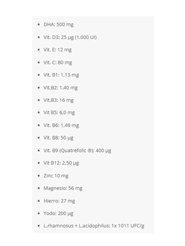 DHA: 500 mg, Vit. D3: 25 μg (1.000 UI), Vit. E: 12 mg, Vit. C: 80 mg, Vit. B1: 1,13 mg, Vit.B2: 1,40 mg, Vit.B3: 16 mg, Vit B5: 6,0 mg, Vit. B6: 1,49 mg, Vit. B8: 50 μg, Vit. B9 (Quatrefolic ®): 400 μg, Vit B12: 2,50 μg, Zinc 10 mg, Magnesio: 56 mg, Hierro: 27 mg, Yodo: 200 μg, L.rhamnosus + L.acidophilus: 1x 1011 UFC/g