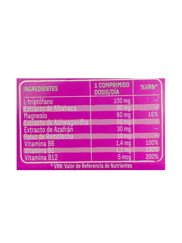 Triptófano, extracto de albahaca, magenesio, extracto de ashwaganda, extracto de azafrán, polvo de remolacha, vitaminas del grupo B.