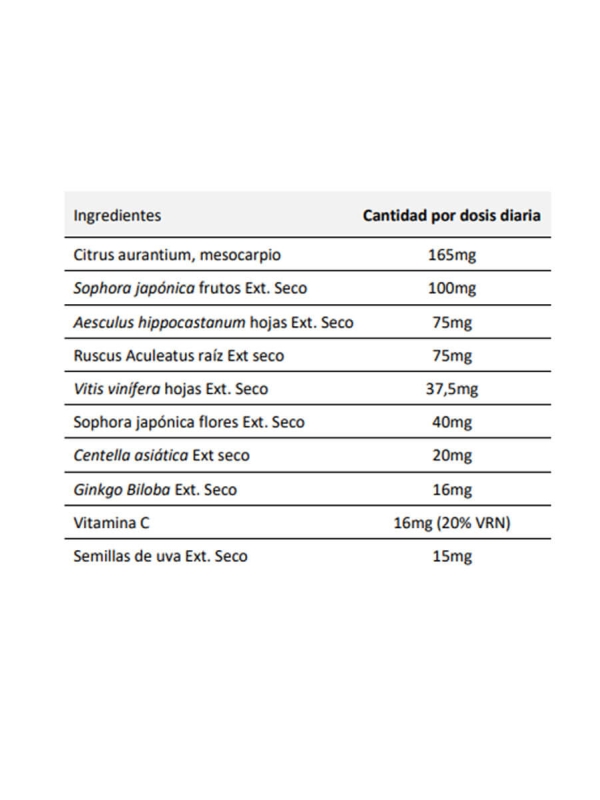 Agente de carga (Hidroxipropilmetilcelulosa), Extracto de Naranjo amargo (Citrus aurantium L., fruto, 90% diosmina), Extracto de Acacia del Japón (Sophora japonica L., flores, 95 % troxerutina), Extracto de Castaño de Indias (Aesculus hippocastanum L., semillas, 20% escina), Extracto de Vid (Vitis vinifera L., hojas, 5% polifenoles), Extracto de Rusco (Ruscus aculeatus L., raiz, 3% ruscogeninas), Extracto de Naranjo amargo (Citrus aurantium L., fruto, 94% hesperidina), Extracto de Acacia del Japón (Sophora japonica L., flores, 95% rutina), Extracto de Centella asiática (Centella asiatica (L.) Urb., partes aéreas y hoja, 10% tritérpenos), L-ascorbato cálcico (Vitamina C), Extracto de Ginkgo biloba (Ginkgo biloba L., hojas, 24% glicósidos de flavonas y 6% lactonas), Extracto de Uva (Vitis vinifera L., semilla, 95% procianidinas), Antiaglomerante (Estearato de magnesio), Colorante (Complejo cúprico de clorofila).