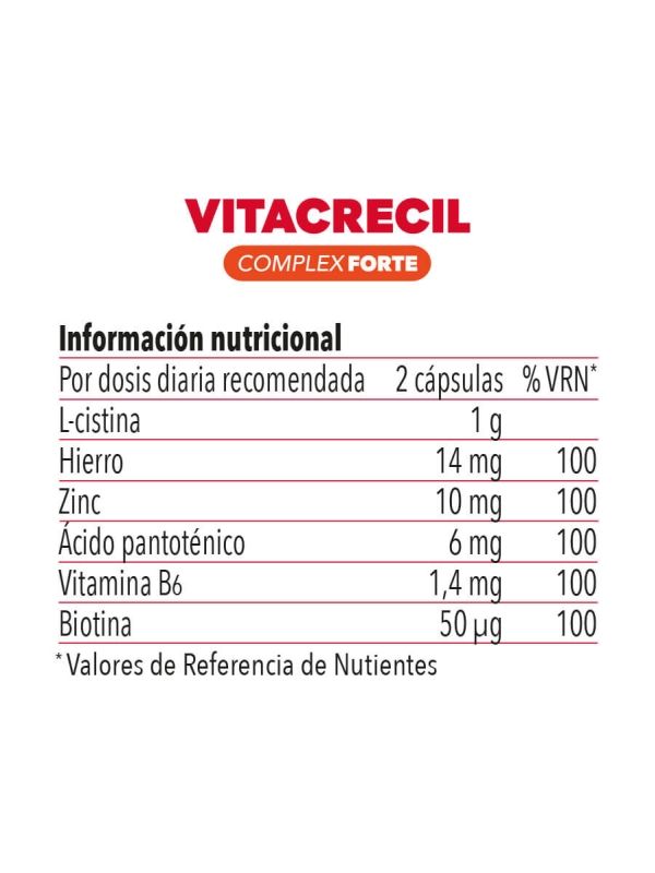 Vitacrecil Complex Forte contiene todos los nutrientes indicados y específicos para aportar vitalidad al cabello y a las uñas únicamente está contraindicado en caso de trastornos de la absorción o eliminación de la cistina, debido a su alto contenido en esta sustancia.