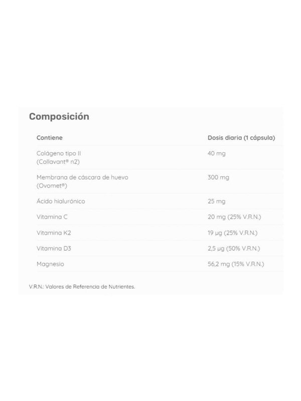 Membrana de huevo en polvo, agente de recubrimiento (hidroxipropilmetilcelulosa), hidróxido de magnesio (magnesio), colágeno nativo tipo II, ácido L-ascórbico (vitamina C), hialuronato sódico, agente de carga (celulosa microcristalina), menaquinona (vitamina K2), antiaglomerante (sales magnésicas de ácidos grasos), antiaglomerante (dióxido de silicio), colorante (complejos cúpricos de clorofilinas), colecalciferol (vitamina D3).