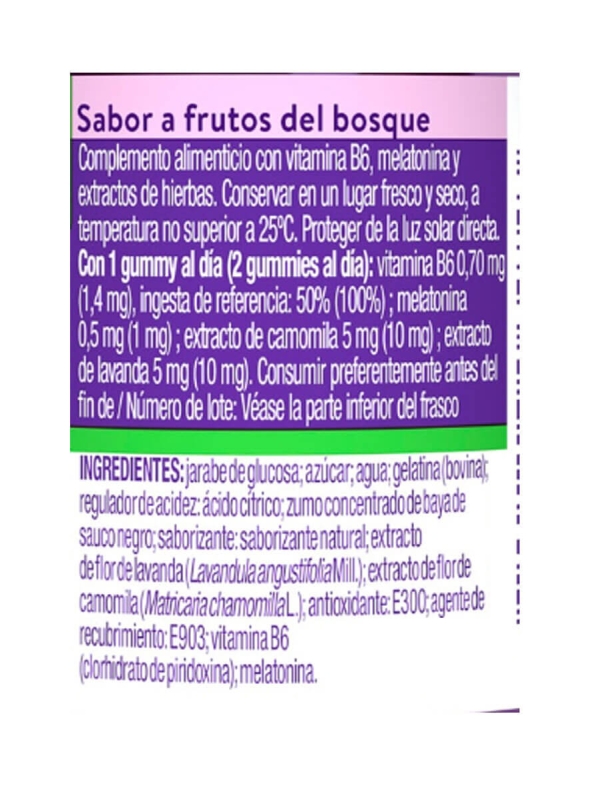 Zzzquil Kids Melatonina sabor frutos del bosque es un complemento alimenticio con melatonina indicada para favorecer el sueño en los niños. Tiene una dosis baja de melatonina, además de incluir camomila, lavanda y Vitamina B6, todos ingredientes seleccionados por sus propiedades relajantes y que favorecen la conciliación del sueño.